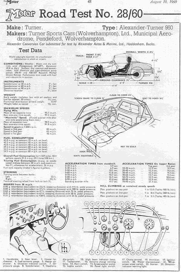 Around town, some frictional damping in the rack and pinion mechanism gives the steering a slightly dead feel, but above 30 m.p.h. or so this unwelcome stiffness is lost. A driver soon acquires confidence that the Turner will go just where he wishes, on the straight or around corners, with a minimum of conscious steering. In the 70-80 m.p.h. speed range a good deal of scuttle shake was evident, but this shake seemed to be at least in part a shortcoming of the coachwork (perhaps it is unwise to mount a heavy 12-volt battery quite high upon the scuttle of a non-metallic body) and was not accompanied by any loss of steering precision. ![]() Disc front brakes are an optional extra for Turner cars with the 948 c.c. engine, and they worked with smooth, silent effectiveness. Usually high pedal pressures were needed on our test model, but we understand that on current production models the pendant pedals have been replaced with their leverages altered to reduce the effort required from the driver; also that despite the expectation that this change would be accompanied by longer pedal travel, an extra inch of legroom has in fact been made available in the cockpit. This body does not look strikingly low, because it extends up to shoulder level beside and immediately behind the driver, who is better protected from back-draught than in many other open cars. None of the luggage accommodation is inside the cockpit; two huge door-compartments and a cubby hole providing ample stowage for almost anything likely to be "wanted on voyage." Under lock and key protection, a very considerable quantity of luggage can be carried in the rear locker, which has the spare wheel flat on it floor. Rather inconveniently, the small 6-gallon petrol tank also has its filler inside the luggage locker.