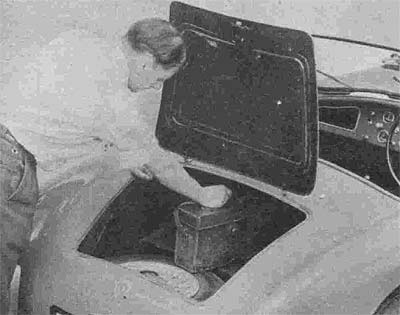 Weather protection is well looked after in the conventional modern sports car manner, by rigid-frame sidescreens, which are very easily installed or removed, and by a hood incorporating three big flexible windows which has a loose fabric and a removable two-piece frame. Sidescreens incorporating sliding window panels, and a removable hard-top, are available if required. Adjustment of the two bucket seats is confined to alternative bolt-down mountings, and for tall people legroom at first seems rather limited, especially as intrusion of the gearbox enclosure into the cockpit leaves no obvious left foot position comfortably away from closely-spaced pedals. After a while, however, a driver seems to settle down behind the offset-to-the-left steering wheel and makes quite long runs without complaining of any discomfort. Carrying the optional tachometer on the test model, the facia with its individual instruments on a panel covered in black plastic fabric seemed entirely appropriate to a sporting car, there being a thermometer, oil pressure gauge and ammeter as well as the fuel contents gauge and speedometer. The two doors do not extend far enough forward to make exit from the body really easy.