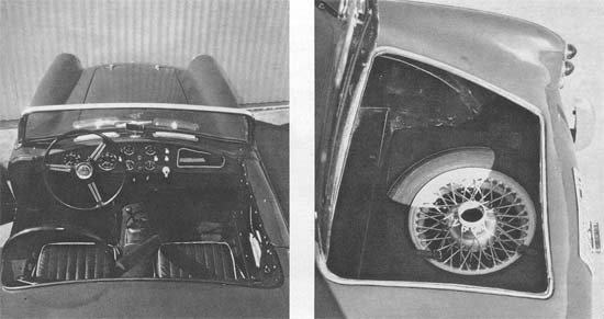 All this is surrounded by a fiberglass, two-seat roadster body. The general appearance is of a simple, functional configuration, neither very new nor very exciting, and not too well finished. But then, the car was designed primarily for competition where finish isn't of utmost importance. However, while the Turner probably won't win a concours, neither is it a design that needs apology. The body is reasonably attractive and certainly functional. Good accessibility to engine, batter, spare tire and luggage space are provided by generous-sized openings which are locked by a special key. A compartment in each door carries most items usually required while on tour: maps, cigarettes, flashlight, gloves, etc.