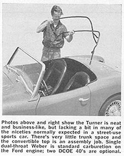 With two optional gear sets for the transmission offered and recognized, there should be littly problems finding exactly the right cogs. There are five final-drive ratios and an optional limited-slip as well. The ratios run from 3.78 to 5.12 to 1. Again, there's enough spread here to gear you properly for any course. There's little the chassis needs to be race-ready. An eptional anti-sway bar is offered. We didn't feel it was required. Presently, only a four-inch rim width is listed for the 13-inch wheels. This may handicap the car a bit from the standpoint of tire stability, and lack of optional rim widths is about the only item of value we can see missing from the SCCA list. 'Tis not a critical item, however, as the light weight of the car makes it easy on the rubber. Braking is well taken care of by 9.5-inch discs on the front end and 8.0-inch drums in the rear. A harder lining material might be required for racing durability (and Mintex can supply this), but we saw no signs of weakness in stopping power after several hot laps with the standard setup. It takes more than one lap to become aware of the Mk II Turner's potential as a production racer, or even a gymkhana or slalom machine. With the engine in stock form it's not a whole lot facter than a good stock Sprite (our test car badly needed a tune-up, but there wasn't time) but everything else is ready to go to work. Once you build up a head of steam, it's easy to retain it due to excellent adhesion, stability and braking. It's an extremely easy car to drive fast, transmitting a good, honest feel to the driver, and slightly understeering. You can change lines in the middle of a "hung-out" corner and all you'll lose is velocity. You canshistly intoa turn atwhat would normally be considered some 15 mph "over your head", yet the Turner is forgiving enough to enable you to get thru with just a little extra work. This feature, some may say, is not particularly desirable in developing a good driver, but it's been our experience that very few pilots have trouble making the transition out of such equipment into more potent machines, and note that did so have ever been what you'd call rough or inefficient drivers. Handling attributes of the Turner make it easy for one to concentrate on going fast smoothly; something hard to learn when you're trying to compensate for excessive roll or "body-walk" or similar spooky traits not uncommon in the vast majority of production sports cars. That about sums our impressions of the Turner. It's not so keen for the street (the top on our test car consistently blew off at 72 mph) but quite an impressive dual-purpose machine. Very limited funds are required to bring it to peak potential and its uncomplicated ruggedness make it a cinch to maintain. As many a wit has seen fit to quip, "Then Bank of America is sponsoring more race cars than Cunningham, Mecom, Paravano, and all other combined ever thought of." So join the ranks. Again, remember that our performance figures are slower than you'll get from a Turner with a fresh tune-up, probably two seconds slower in the Quarter-Mile. You may evenfind it quite enjoyable for street transportation ... if your're the rugged outdoors type. - Jerry Titus